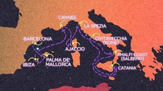 Visiting: Barcelona, Palma de Mallorca, Spanish Isle, Ibiza, Cannes, Ajaccio, La Spezia, Cinque Terre, Salerno + Amalfi, Catania, Civitavecchia (Rome)